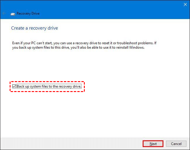2. In the Recovery Drive window, you can check the option "Back up system files to the recovery drive", and then, click Next.