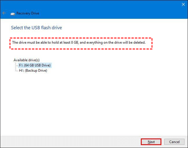 3. Select the USB drive that you want to use for the recovery drive. Click "Next".