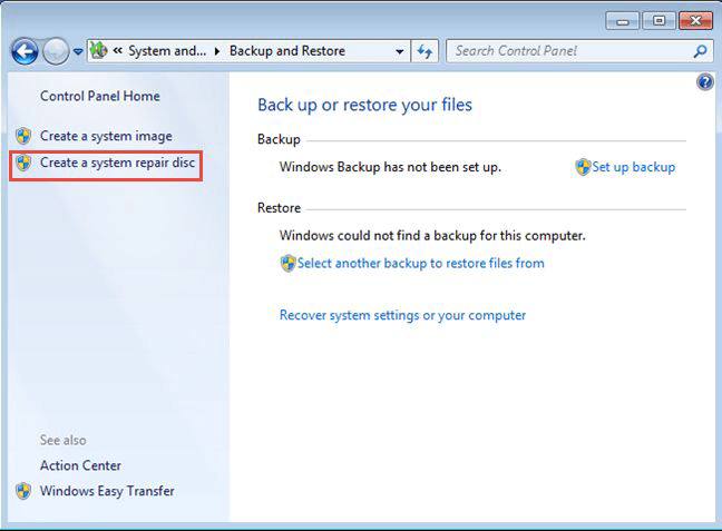 1. Insert a blank (unformatted) CD/DVD to your computer, get into "Control Panel"-> "Backup and Restore" , and then, click "Create a system repair disc" on the left.