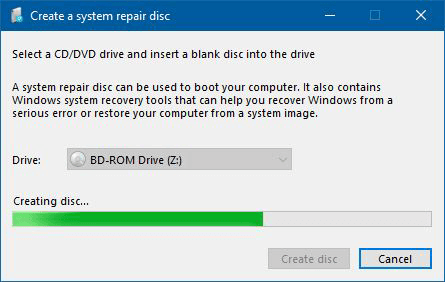 3. The Windows will begin to create a system repair disc. it will be faster than creating a recovery drive because it won't backup system files to the disc.