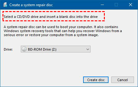 2. Then, you will get into the Create a system repair disc window. Select the CD/DVD on your computer, click "Create disc".