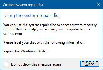 4. When it's done, it gives you a note about using the system repair disc. Click "Close" and then click " OK" to close the "Create a system repair disc" window.